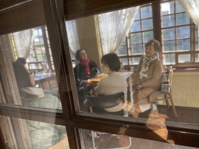 現在はポーチ(ベランダ)の空間がカフェになっていて、こちらでお茶&パウンドケーキをいただきながら(さっきフルコースを食べたばかりなのに!?)、外の梅の花を眺めつつお喋りに花を咲かせる私たち。