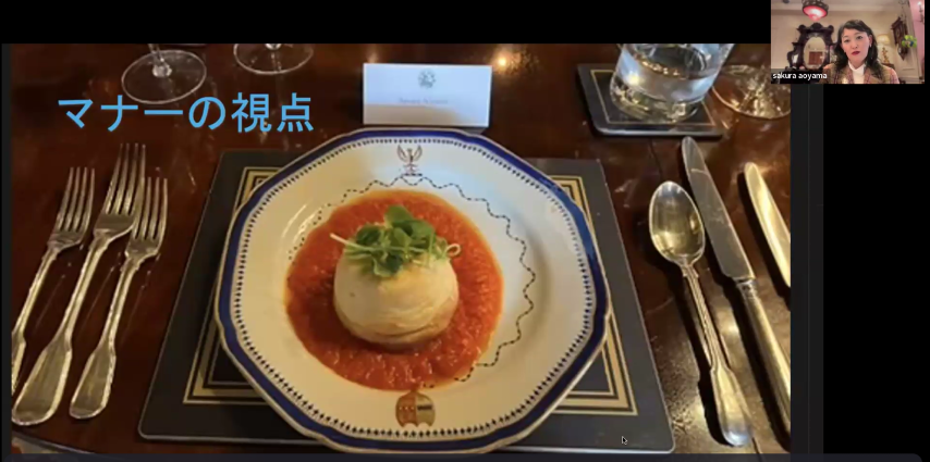 そんな説明を一通りいただいた後、映画「ダウントンアビー」に登場するハイクレア城の内部について、詳しいご紹介をいただきました。実際に訪れ城内でディナーをされたという体験を、建築や家具、テーブルウェアに至るまでつぶさに観察いただき、マナー(作法)の視点やアンティークの視点を解説してくださいました。