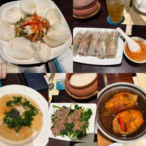 中心部に建つホーチミン市人民委員会庁舎、もちろん入れないどころか付近2メートルには近づけないとのことですが、離れたフォトスポットでみなさんで記念撮影をし、お昼ごはんのレストラン COM NEU SAIGON へ。このレストランではおこげを土釜を割って「投げる」実演付!