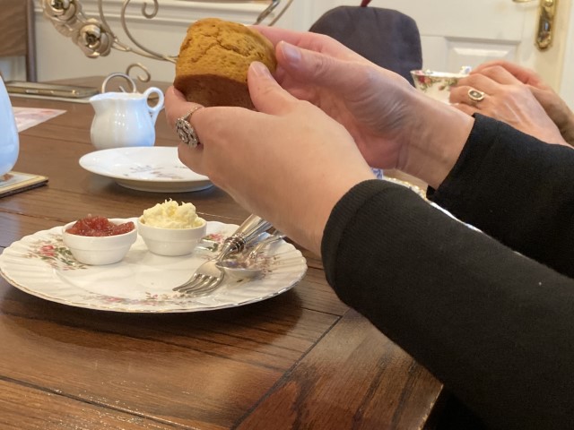 「スコーンナイフでスコーンを半分に切る、と思っている方が多いのですが、元々スコーンは手で割るんです、そして奇麗に割れるように作られているんですよ」とスコーンを半分に割る実践まで。全員ちゃんと出来ましたよ!