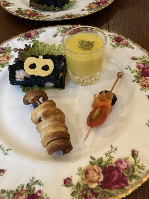 日本ではアフタヌーン・ティーのブームがここ何年か続いていますが、それぞれのところが季節ごとにテーマを設定して、そのテーマにちなんだフーズやペイストリーを出すところが増えています。今回のこちらのアフタヌーン・ティーのテーマはハロウィンでした。