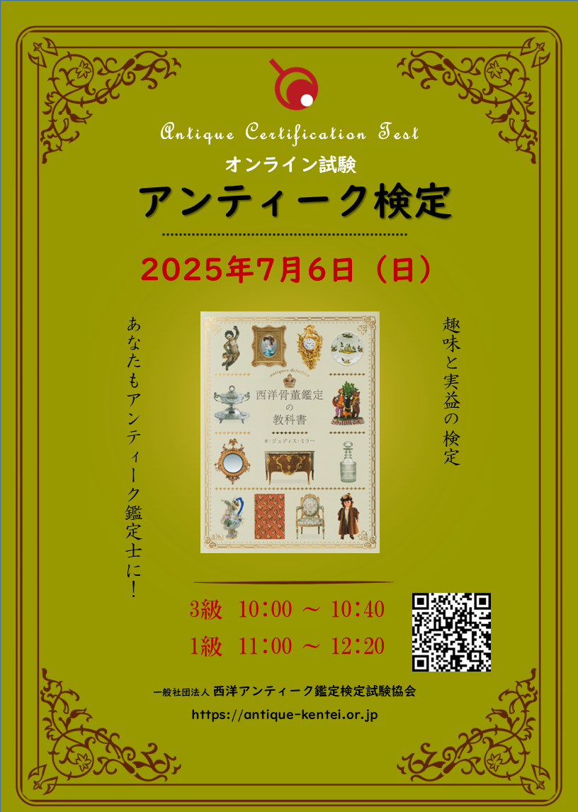 | 2025.7.18 | 第15回アンティーク検定試験の結果を7月22日の週に申込時住所宛へ郵送いたします。郵便事情により時間を要することがございますが、万一7月28日までに届かない場合、7月29日以降事務局へお問い合わせください。 |