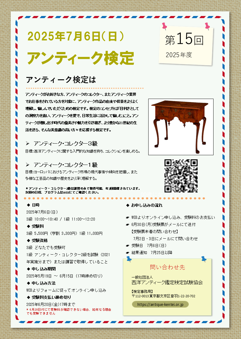 受験科目:西洋美術史 / 西洋装飾美術工芸史 / 外国語(英語またはフランス語) / 現代時事アンティーク